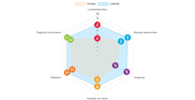 Bram: ‘Het verschuift van zorgprofessional naar inwoner, en van inwoner naar inwoner. Dat vind ik mooi. Natuurlijk blijft Heleen welkom bij mij met lichamelijke klachten. En al is het een aanname, het ligt voor de hand dat mensen die actief aan hun leefstijl werken uiteindelijk minder zorg nodig hebben.’ Dat is terug te zien in het Positieve Gezondheid spinnenweb dat Mirjam bij zich heeft tijdens het interview. Het spinnenweb is het resultaat van een vragenlijst. Zo maak je inzichtelijk wat het effect is van wat je afgelopen tijd hebt gedaan. Er is een groot verschil tussen de eerste vragenlijst die Heleen invulde en de laatste. Bijvoorbeeld op het gebied van zingeving. Dat vindt Heleen een belangrijk onderwerp.